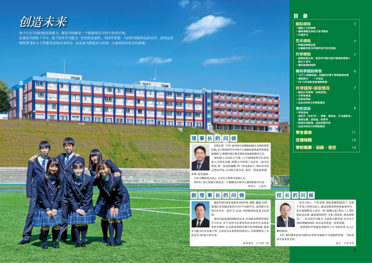 鹿島學園高中偏差值45~47,1988年開校,教室、圖書館、體育館、宿舍等各種設施,一應俱全。學校定員720人,留學生占比16%,其中以中國留學生居多,此外還有韓國、泰國、越南等國家留學生,是個國際化的校園,除了和日本學生進行溝通,還可以進行多地域文化交流。課程類別豐富,有一般升學課程、藝術課程和國際課程。另外課外活動(足球、棒球等)豐富。周一到周五下午3:30—5:30是課外活動時間。學生可以自由選擇志愿者活動、社團活動和課外補習。周末學校會舉辦豐富多彩的活動充實高中生活。