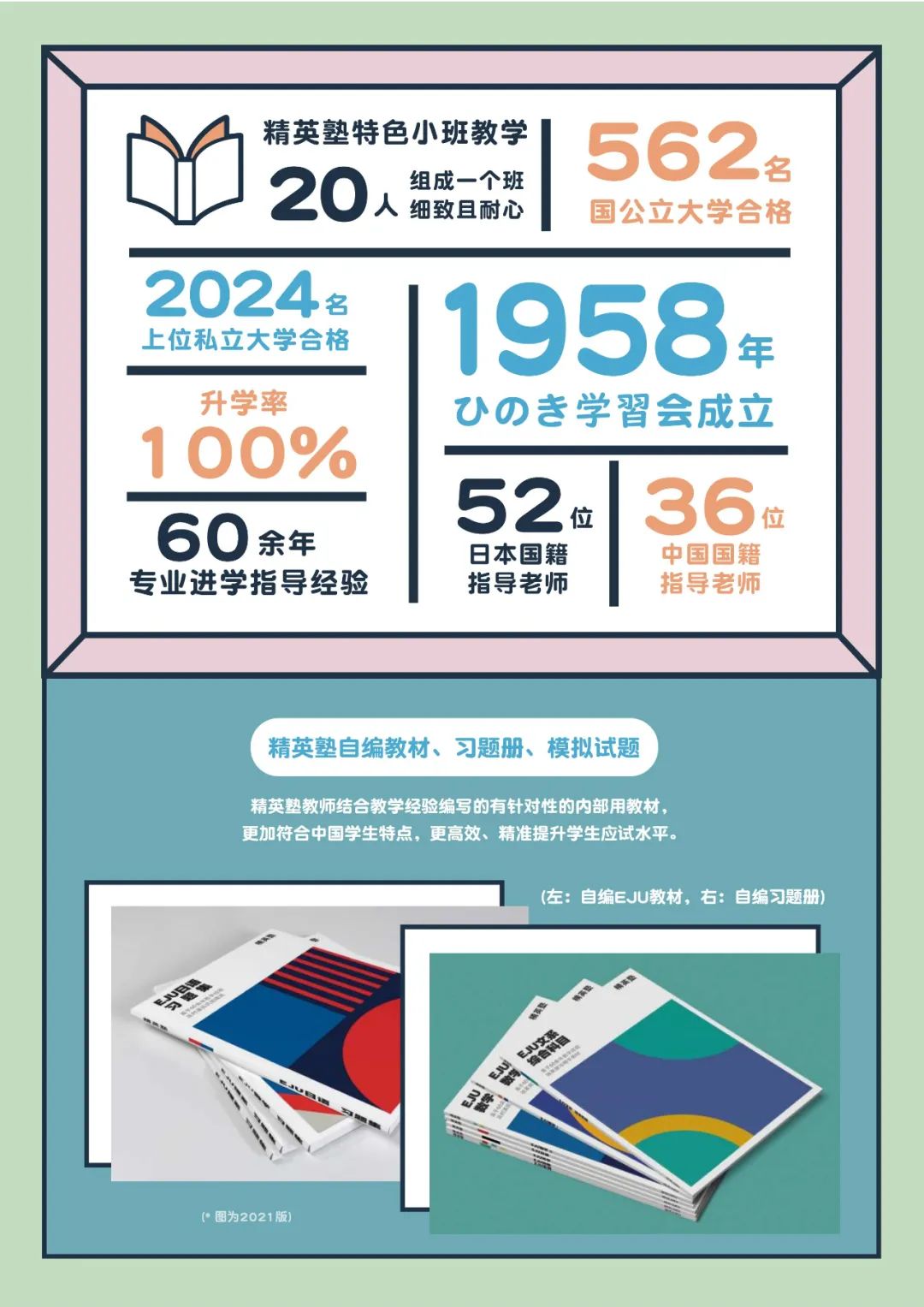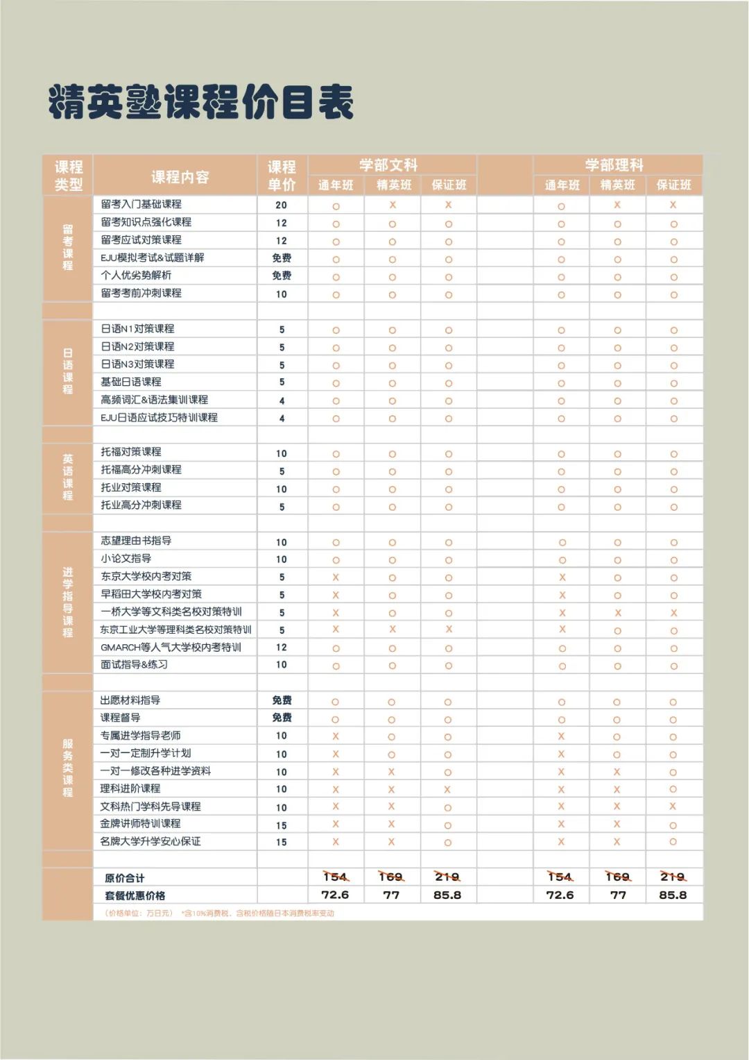 全日制保錄班、精英班課程,針對日本留學生考試及名校校內考的對策型課程,教材由學校依據歷年考題編寫的習題,以及書店最受歡迎的輔助教材,另外還有托福和托業的對策講座。