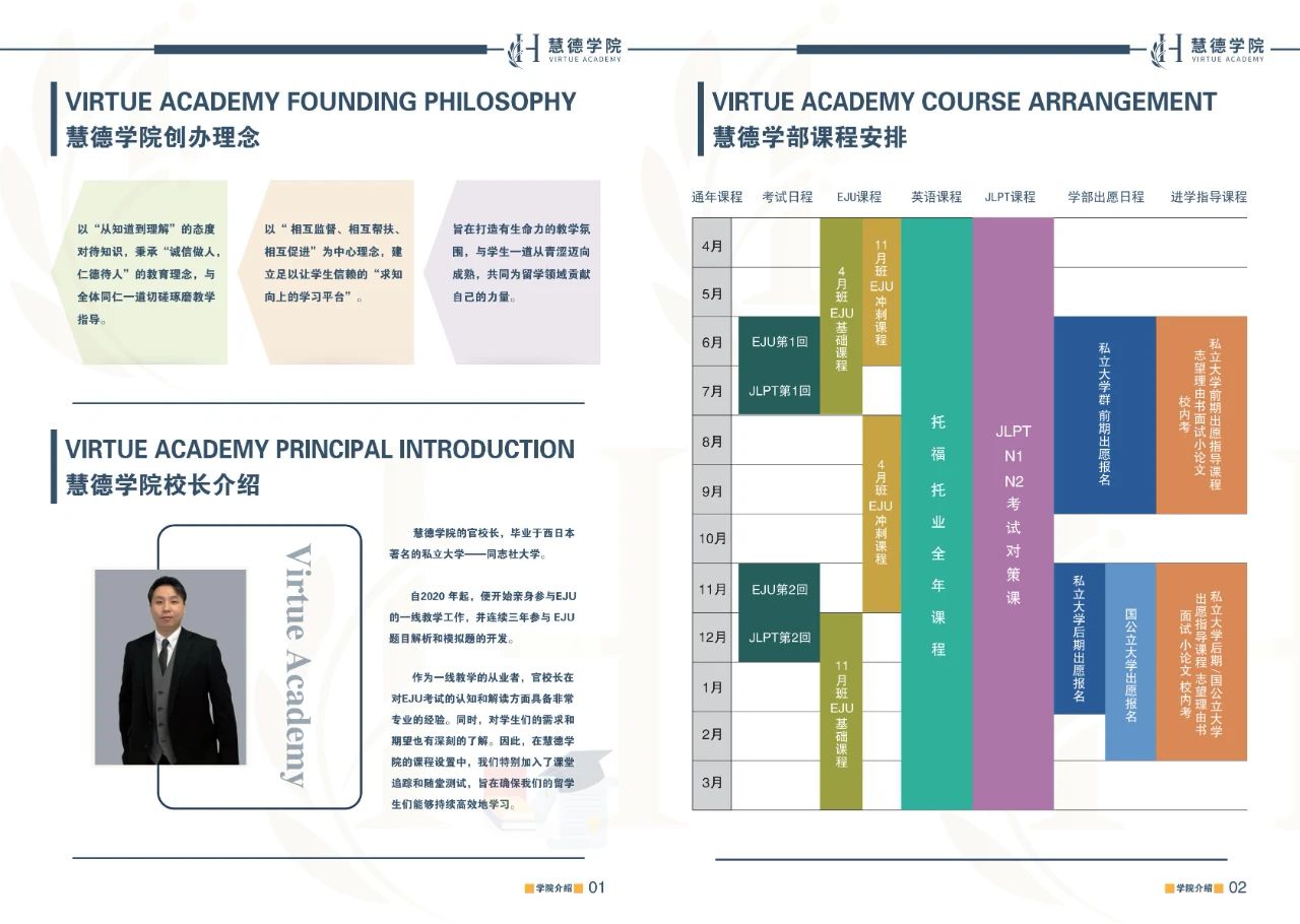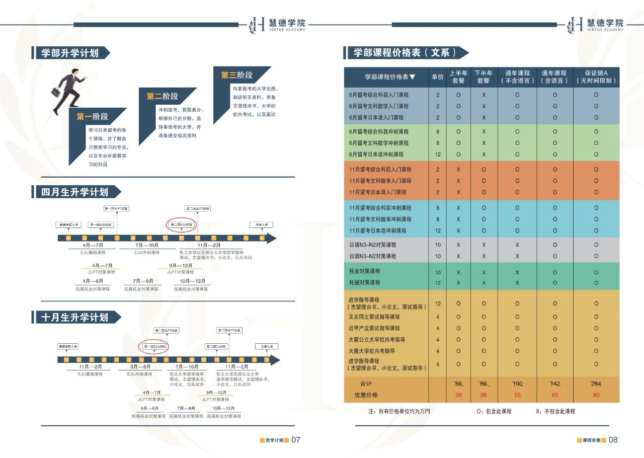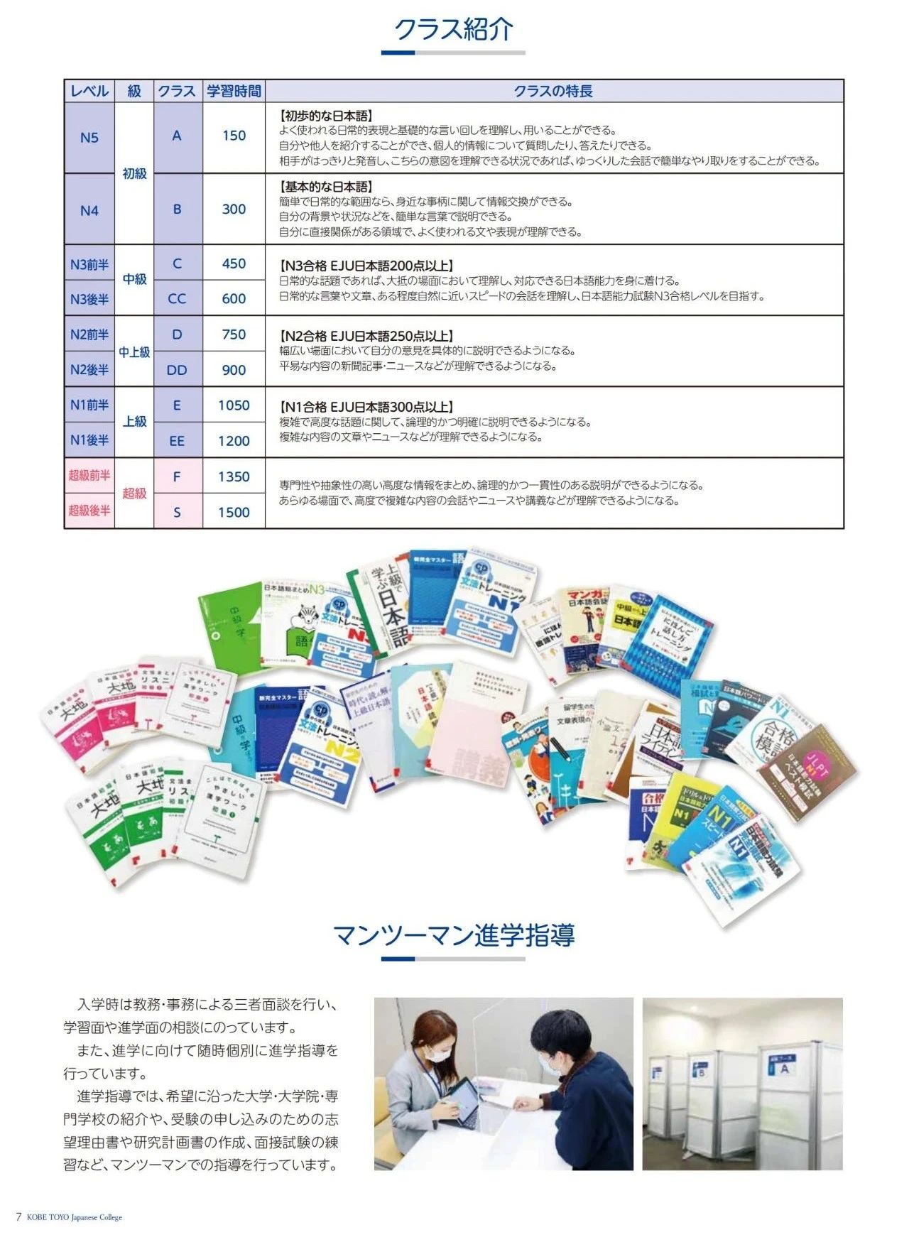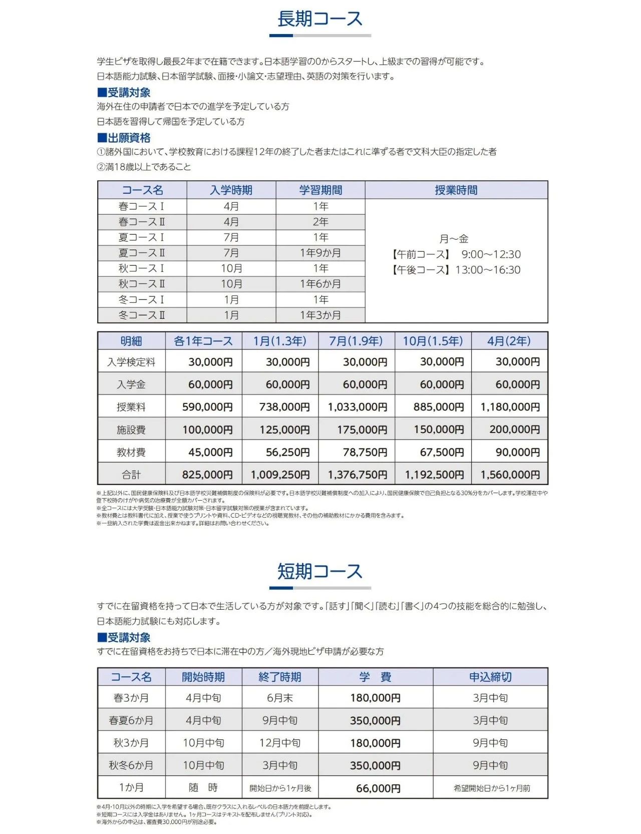 除常規日語課程外,還開設英語T0EFL和數學(文、理科)以及文綜和理綜升學指導課程。針對大學、大學院教授面試的相關內容進行一對一指導。為有留目就職意愿的學生提供專門的就職指導,組織就職說明會,指導學生書寫就職簡歷、面試練習、參加公司實習等